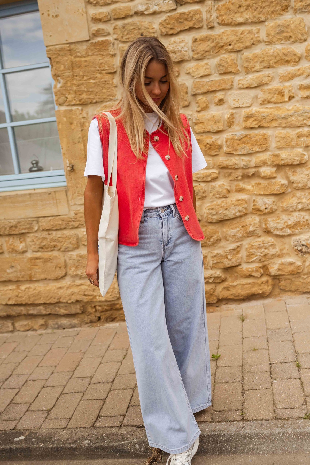 Mit ihrem kräftigen Rot und der sanft verwaschenen Optik bringt die LINA™ Sommerweste den Charme vergangener Tage zurück – frisch interpretiert für den modernen Alltag. Sie ist ein Stück lässige Eleganz, das mühelos zwischen City-Flair, Urlaubsmomenten und entspannten Spaziergängen wechselt.